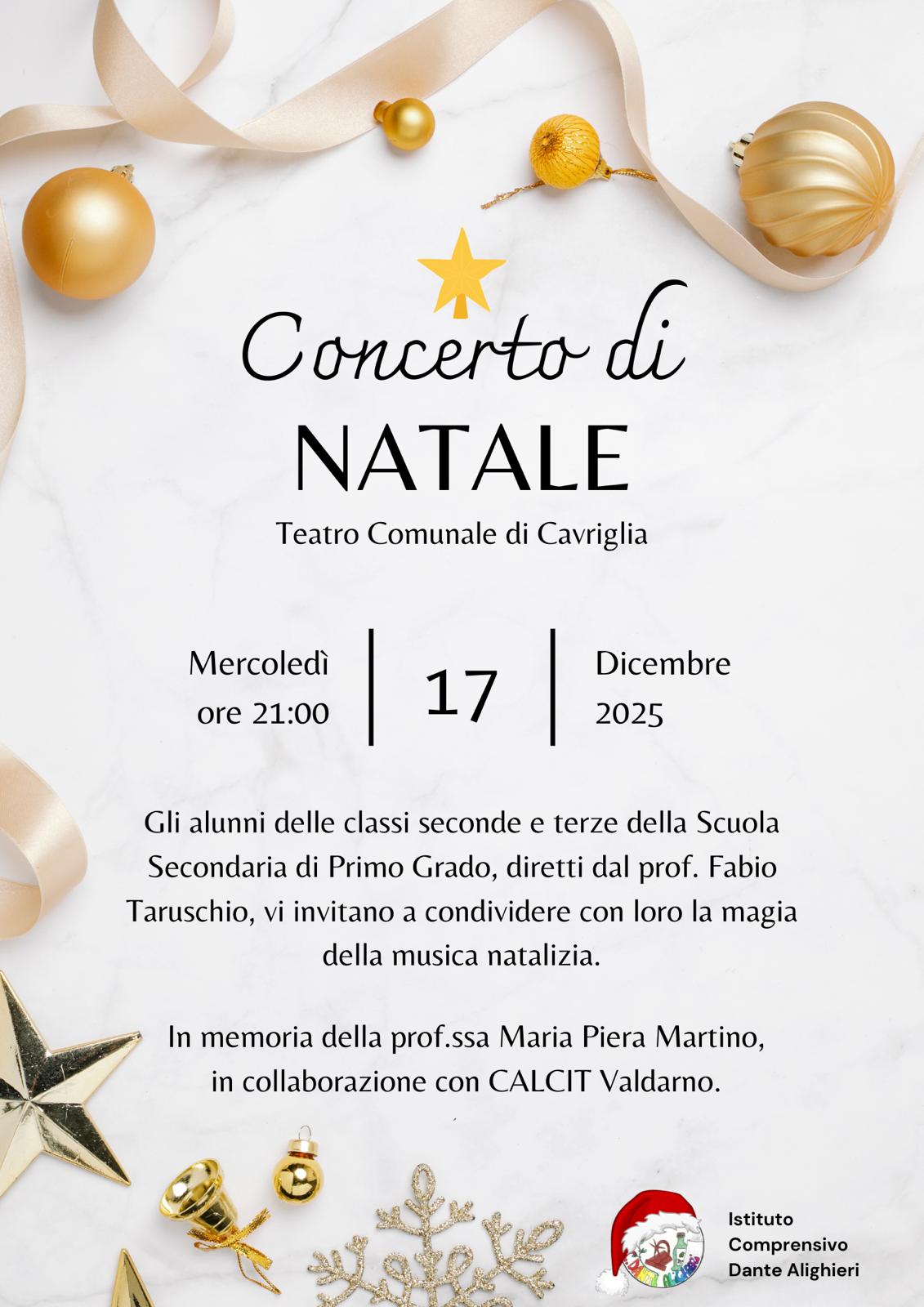 ☃️⭐ 𝐂𝐎𝐍𝐂𝐄𝐑𝐓𝐎 𝐃𝐈 𝐍𝐀𝐓𝐀𝐋𝐄🎄🎅 📍 Teatro Comunale – Cavriglia 📆 Mercoledi 17 dicembre alle ore 21,00. Gli alunni delle classi seconde e terze della Scuola Secondaria di Primo Grado dell’Istituto Comprensivo Dante Alighieri dirette dal Prof. Fabio Taruschio vi invitano a condividere con loro la magia della musica natalizia. In ricordo della Professoressa Maria Piera Martino. ℹ In questa occasione le classi terze collettivamente e gli insegnanti e le insegnanti diventano soci Calcit Valdarno. Vi aspettiamo!❤❤❤