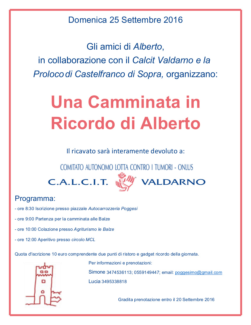 Camminata per alberto 2016La Sez. di Castelfranco ha organizzato il 25 Settembre 2016 “Una camminata in ricordo di Alberto” ore 9,00-12,00. Una camminata fra le Balze con colazione  e aperitio,  immersi nella bellezza della natura, per ricordare il carissimo amico Alberto Betti: GRAZIE a Tutti della calorosa partecipazione ! Durante la manifestazione sono stati raccolti, e interamente devoluti, €. 1.685,00= per il sostegno dei progetti del C.A.L.CI.T. Valdarno.