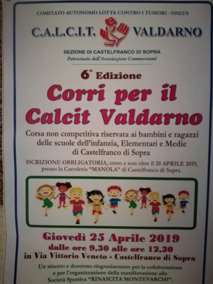 Giovedì 25 Aprile 2019 dalle ore 9:30 alle 12:30 in Via Vittorio Veneto si è tenuta la sesta edizione della Corsa riservata ai Bambini ed ai Ragazzi delle Scuole dell’Infanzia, Elementari e Media di Castelfranco di Sopra. Un caloroso Grazie a Tutti i partecipanti OLTRE 130 RAGAZZI ! Ed in particolare un sincero e doveroso ringraziamento alla Società Sportiva “RINASCITA Montevarchi” per la collaborazione e per l’organizzazione della manifestazione !