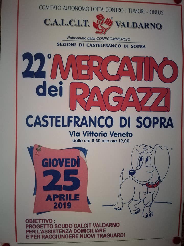 giovedì 25 aprile 2019, dalle ore 8,30 alle 19,00, in via Vittorio Veneto si è tenuta la 22° edizione del Mercatino dei Ragazzi a Castelfranco di Sopra, in contemporanea con Loro Ciuffenna, uniti nell’obiettivo del sostegno al Progetto Scudo ed alle tante iniziative del C.A.L.C.I.T. Valdarno. Sono stati raccolti fondi per oltre €. 5.000,00= Grazieee!!!