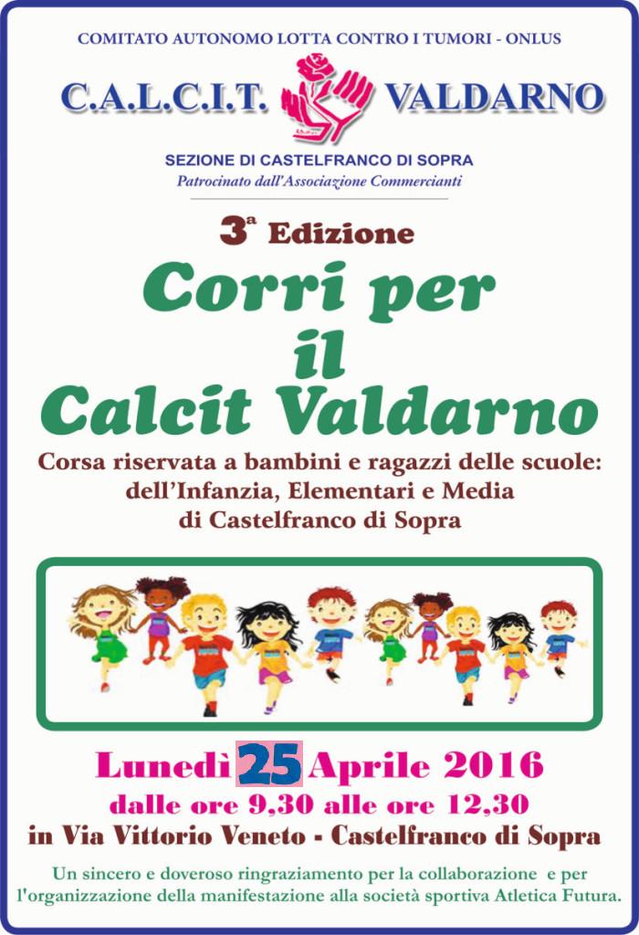 3a Edizione “Corri per il C.A.L.C.I.T. Valdarno”Lunedì 25 Aprile 2016 dalle ore 9,30 alle 12,30 in Via Vittorio Veneto si è tenuta la ormai tradizionale Corsa riservata ai Bambini ed ai Ragazzi delle Scuole dell’Infanzia, Elementari e Media di Castelfranco di Sopra. Un Grazie a Tutti i Partecipanti ed in particolare un sincero e doveroso ringraziamento alla Società Sportiva Atletica Futura per la collaborazione e per l’organizzazione della manifestazione !!! |