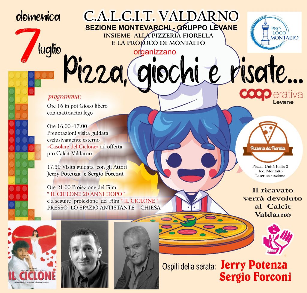 Volete rivivere l’emozione del “il Ciclone” non prendete impegni per Domenica 7 Luglio. Calcit Valdarno sez. Montevarchi gruppo Levane vi faranno vivere una giornata indimenticabile: giochi lego per bambini (Montalto) visita al casolare e incontro con gli attori Sergio Forconi , Jerry Potenza (Monsoglio) e la sera tutti insieme a vedere il film campione d’incassi (Montalto). Forse avremo anche la visita di Giuliano Grande, quello della famosa frase “che c’è l’hai un gratta e vinci te?” Ingresso libero, saranno gradite offerte per il progetto Scudo del Calcit Valdarno (assistenza domiciliare). Ringraziamo Pro loco Montalto, pizzeria Fiorella e coop Levane.