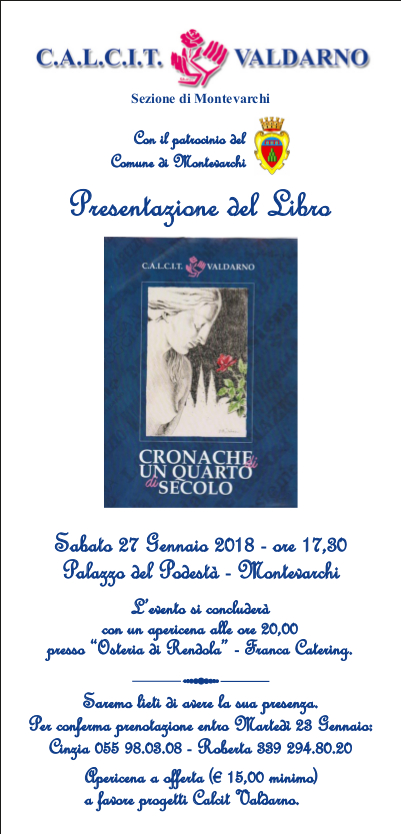 Presentazione del Libro “C.A.L.C.I.T. Valdarno : Cronache di un quarto di secolo” a Montevarchi Sabato 27 gennaio 2018 – a seguire apericena – offerta libro domenica 28 con il “mercatino di via dei musei”.